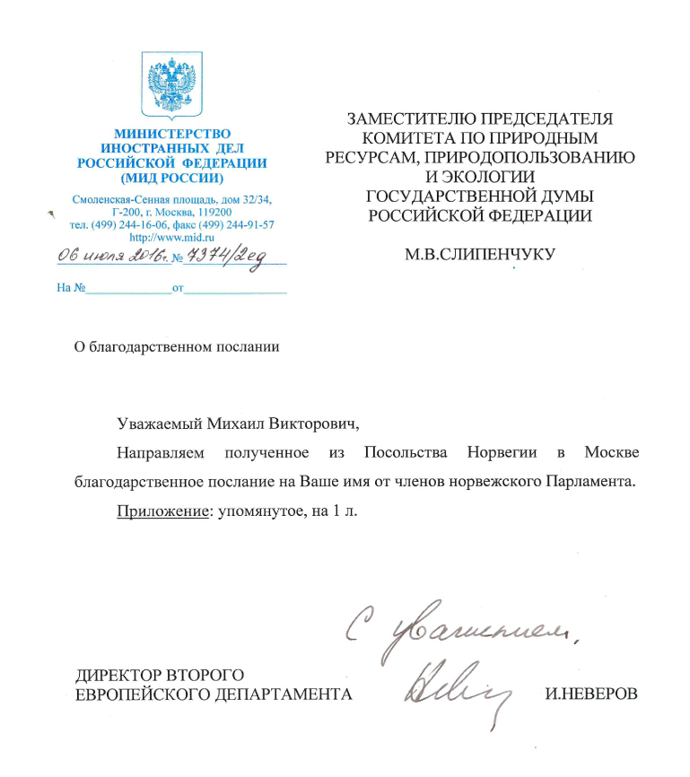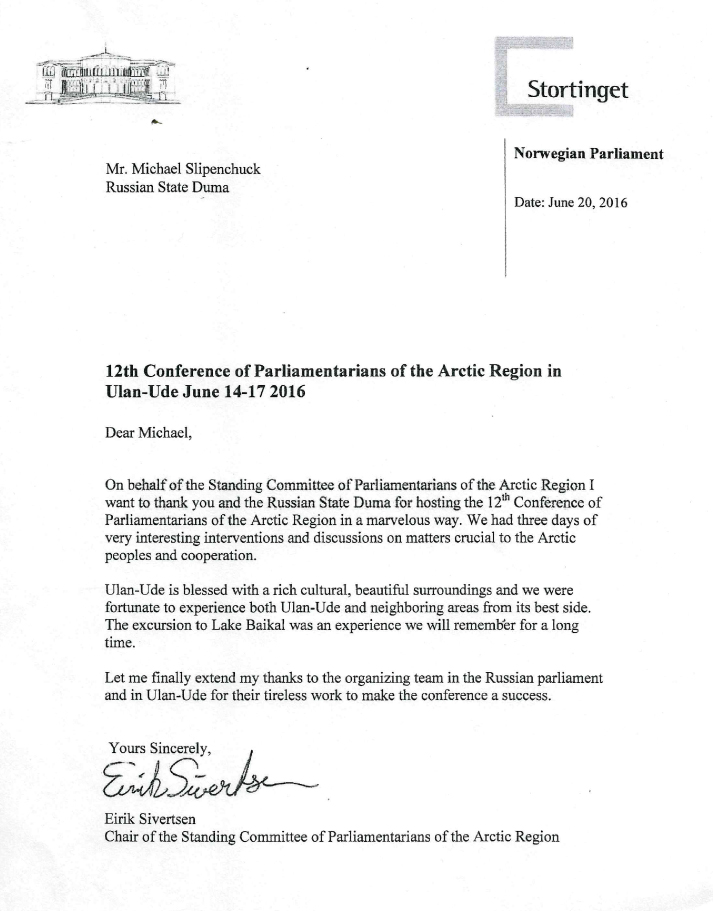 Благодарственное письмо от членов парламента Норвегии за проведение 12-й Конференции парламентариев Арктического региона в Улан-Удэ